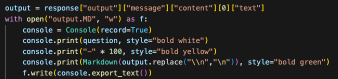 Now I just need to print to the screen to see the results. This is where I use the rich package I imported earlier just so we may have a nicely formatted output as I’m expecting a long response for this one. I also save the output to a file so I can have it handy as something to share with my teams.