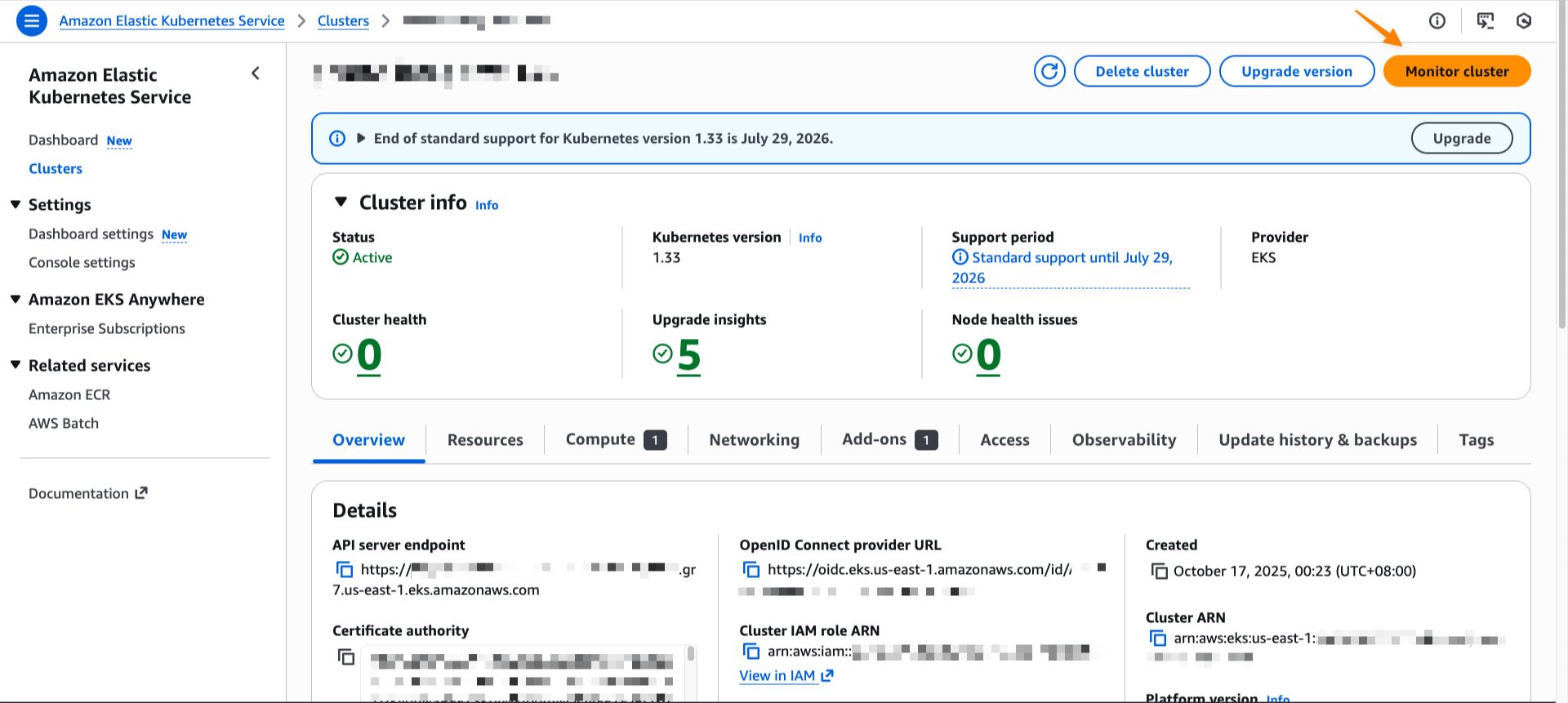 After it’s enabled, I can navigate to my EKS cluster and select Monitor cluster.
