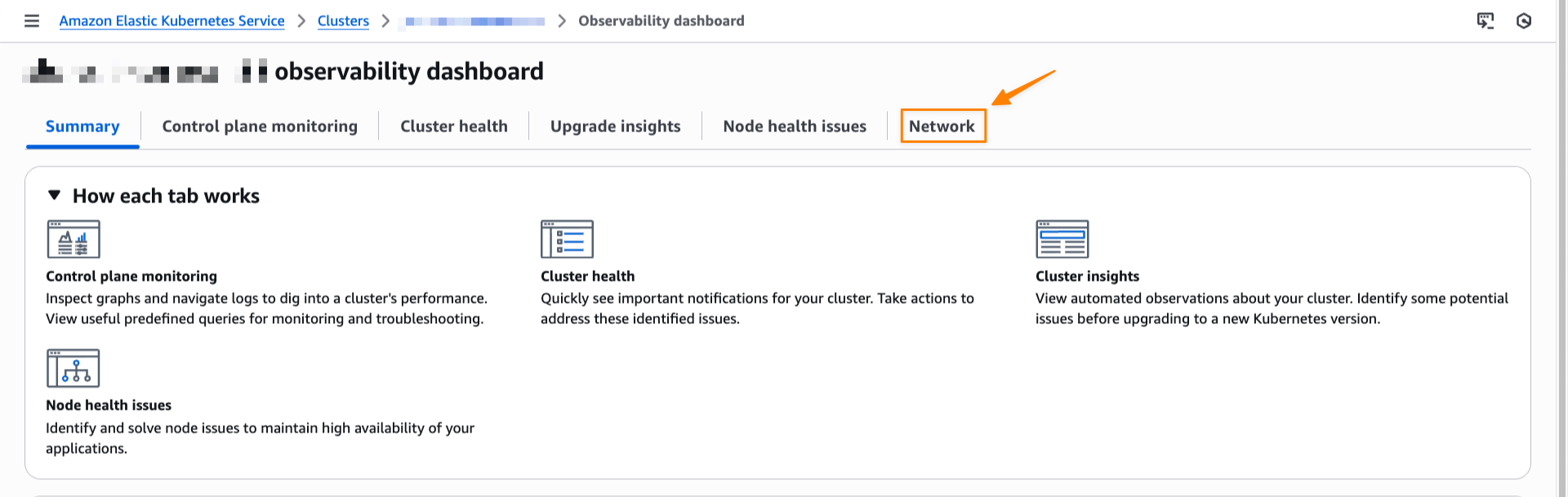 This will bring me to my cluster observability dashboard. Then, I select the Network tab.