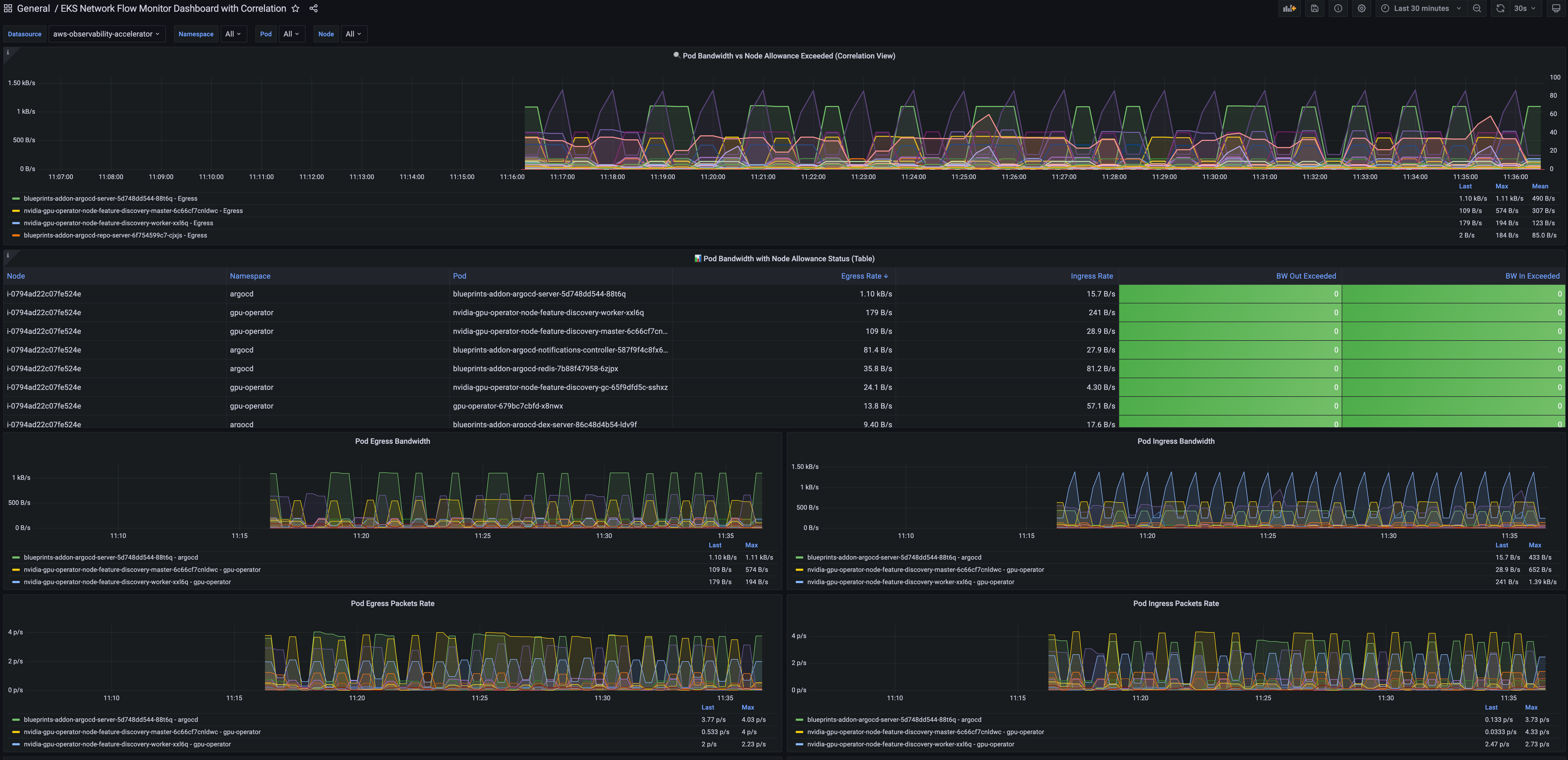 With Performance metrics, you can now scrape network-related system metrics for pods and worker nodes directly from the Network Flow Monitor agent and send them to your preferred monitoring destination. Available metrics include ingress/egress flow counts, packet counts, bytes transferred, and various allowance exceeded counters for bandwidth, packets per second, and connection tracking limits. The following screenshot shows an example of how you can use Amazon Managed Grafana to visualize the performance metrics scraped using Prometheus.