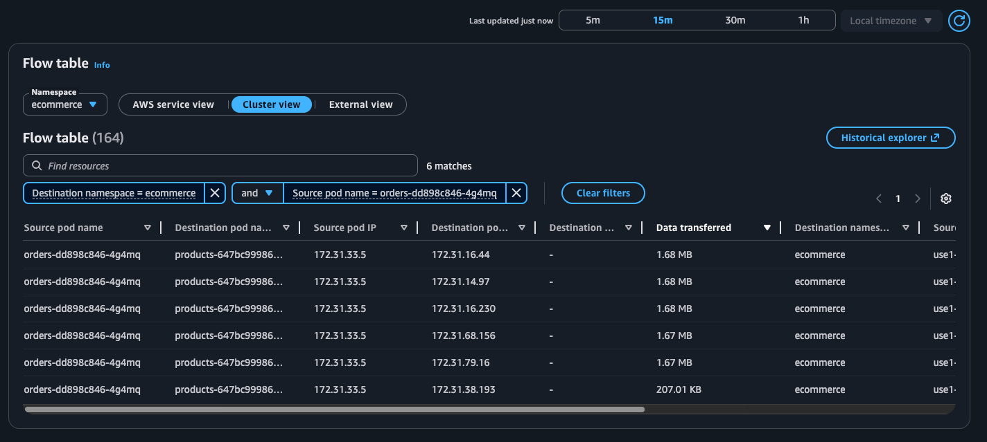 The flow table provides detailed metrics and filtering capabilities to analyze network traffic patterns. In this example, we can see the flow table displaying cluster view traffic between our e-commerce services. The table shows that the orders pod is communicating with multiple products pods, transferring amounts of data. This pattern suggests the orders service is making frequent product lookups during order processing.