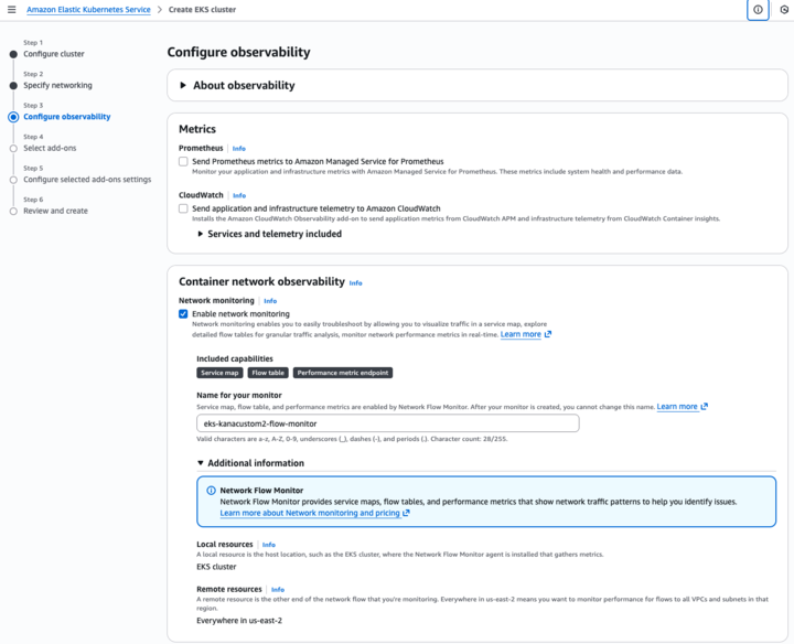 I can enable this new feature for a new or existing EKS cluster. For a new EKS cluster, during the Configure observability setup, I navigate to the Configure network observability section. Here, I select Edit container network observability. I can see there are three included features: Service map, Flow table, and Performance metric endpoint, which are enabled by Amazon CloudWatch Network Flow Monitor.