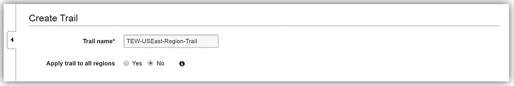 You then would enter a trail name in the Trail name text box and select the radio button for the option of applying your trail configuration to all regions or only for the region you are currently in. For this example, I’ll name my trail, TEW-USEast-Region-Trail, and select No for the Apply trail to all regions, radio button. This means that this trail will only track events and activities in the current region, which right now is US-East (N. Virginia). Please note: A best practice is to select Yes to the Apply trail to all regions option to ensure that you will capture all events related to your AWS account, including global service events.