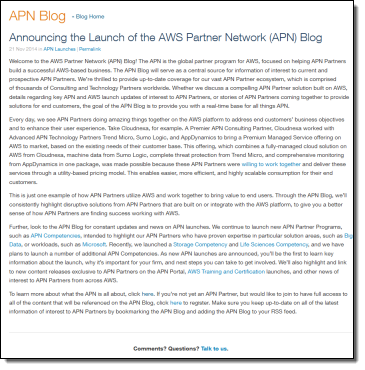 Today we are launching a new AWS Partner Network Blog that will serve as a central source for information that will be of interest to current and prospective APN Partners. We plan to provide up-to-date coverage of the entire partner ecosystem. Look for posts that discuss compelling APN solutions built on AWS, details on key AWS and APN launches of special interest to APN Partners, and stories of two or more APN Partners working jointly to provide a solution for a customer. The new blog is designed to serve as a real-time base for all things APN.