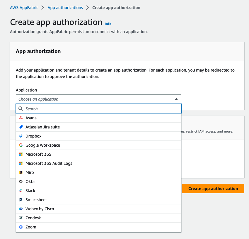 Once I have created the app bundle, the next step is Create app authorization. On this page, I can select the supported SaaS application that I want to connect to my app bundle.