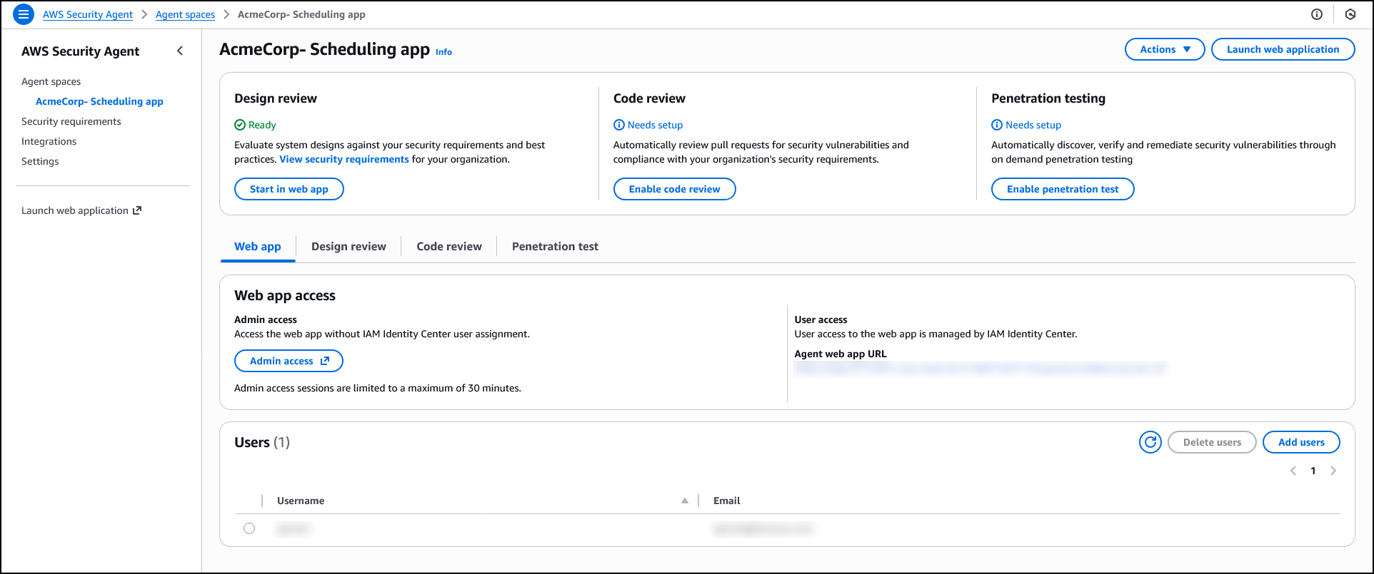 When you create the first agent space in the AWS Management Console, AWS creates the Security Agent Web Application. The Security Agent Web Application is where users conduct design reviews and execute penetration tests within the boundaries established by administrators in the console. Users select which agent space to work in when conducting design reviews or executing penetration tests.