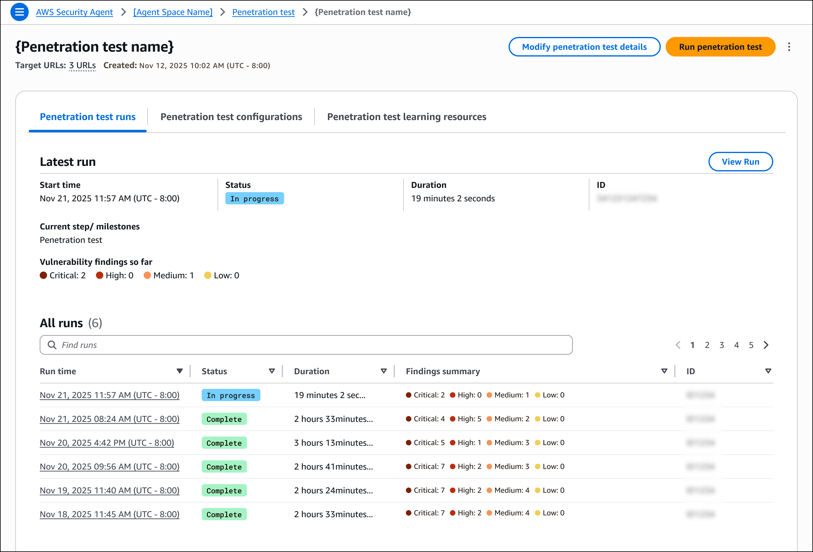 After creating and running a penetration test, the detail page provides an overview of test execution and results. You can run new tests or modify the configuration from this page. The page displays information about the most recent execution, including start time, status, duration, and a summary of discovered vulnerabilities categorized by severity. You can also view a history of all previous test runs with their findings summaries.