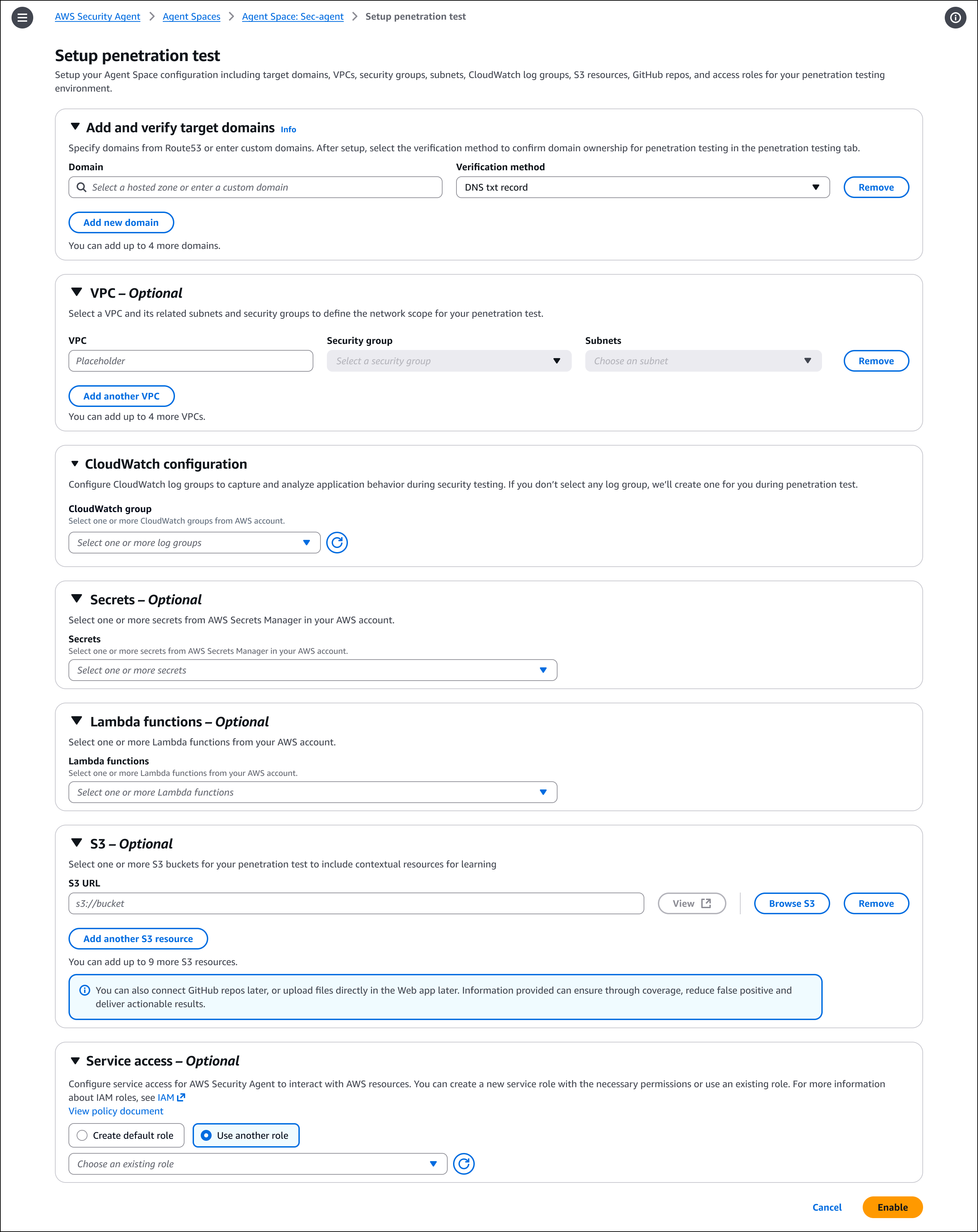 To enable penetration testing, choose Enable penetration test on the agent configuration page. You can configure target domains, VPC settings for private endpoints, authentication credentials, and additional context sources such as GitHub repositories or S3 buckets. You must verify ownership of each domain before AWS Security Agent can run penetration testing.