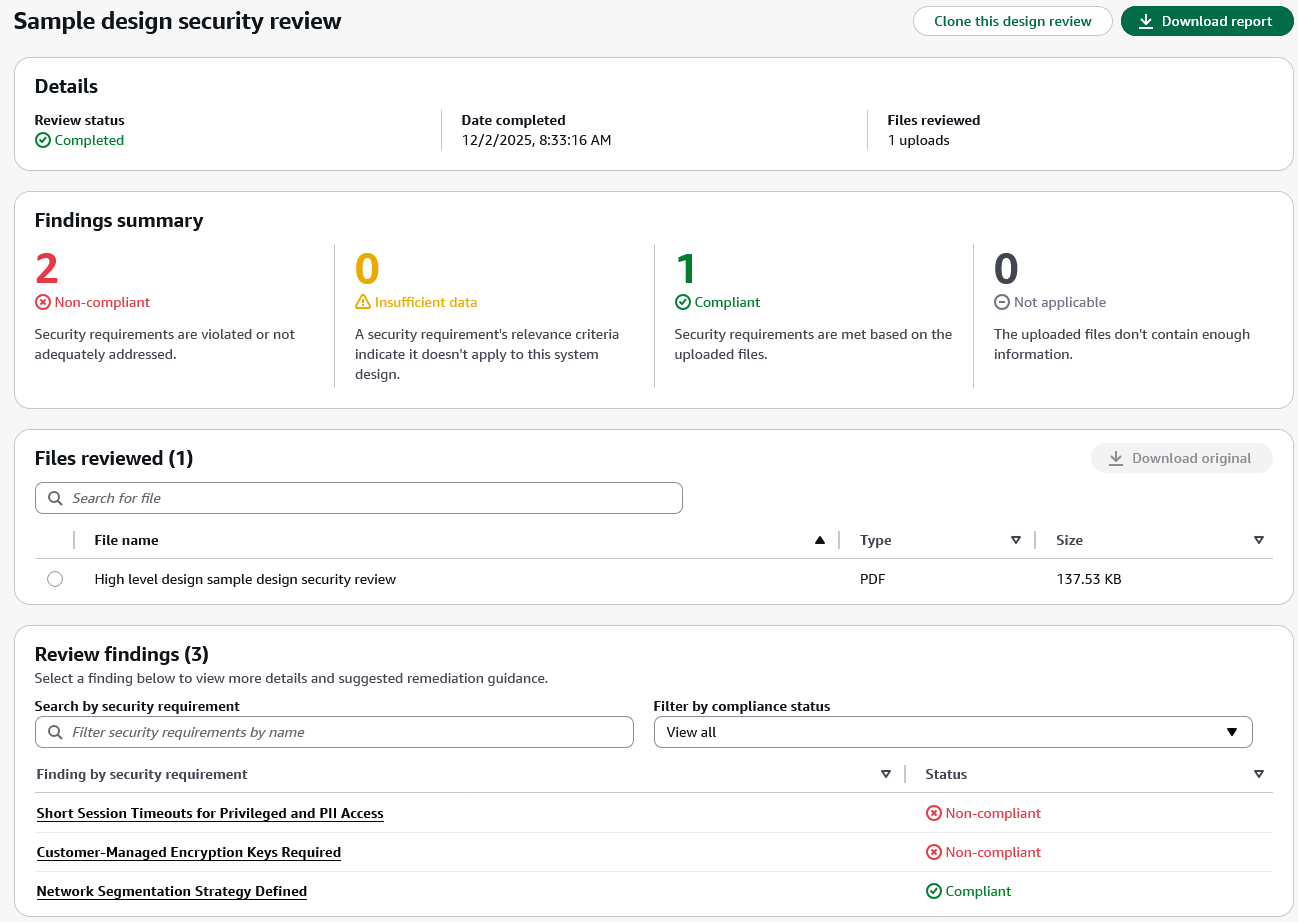 When you choose a specific finding, AWS Security Agent displays detailed justification explaining the compliance status and provides recommended remediation steps. This context-aware analysis helps you understand security concerns specific to your design rather than generic security guidance. For designs with noncompliant findings, you can update your documentation to address the security requirements and create a new design review to validate the improvements. You can also choose Clone this design review to create a new assessment based on the current configuration or choose Download report to export the complete findings for sharing with your team.
