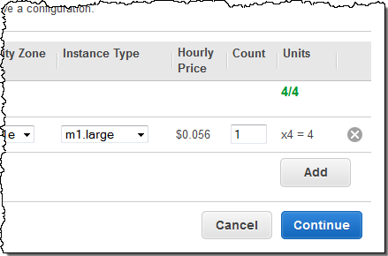 For example, you can replace four m1.smalls with a single m1.large, by editing the Instance Type and Count properties as follows: