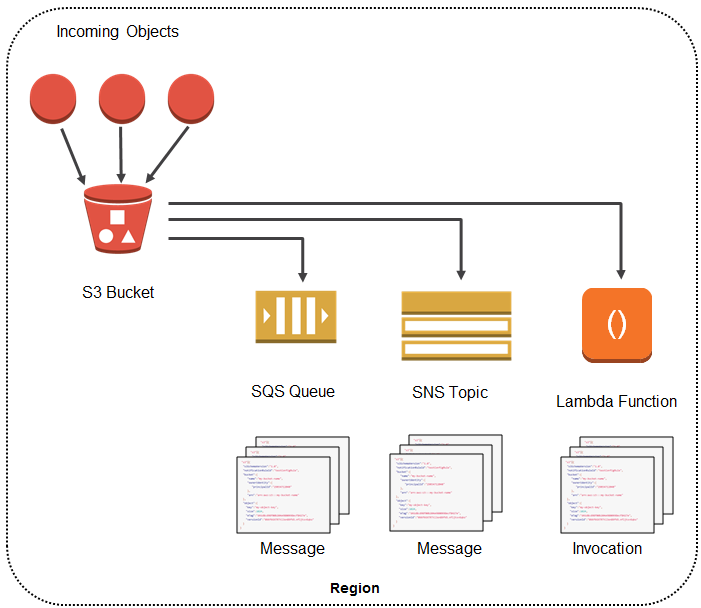 - Regions – The bucket and the target (Amazon SQS, Amazon SNS, or Lambda) must reside in the same AWS Region.