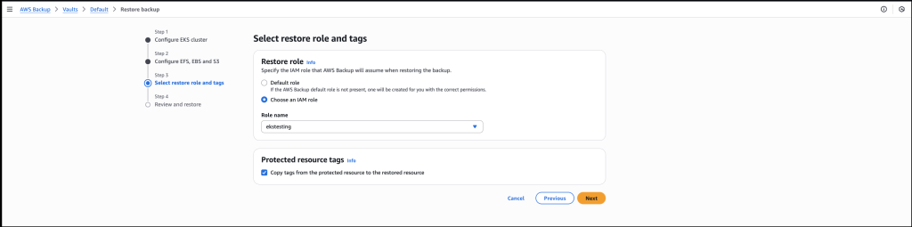 Next, I Choose an IAM role to execute the restore action. The Protected resource tags checkbox is selected by default and I’ll leave it as is, then choose Next.
