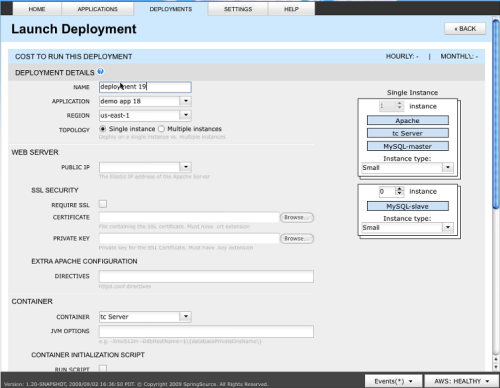 You can upload one or more WAR (Java web application) files to Cloud Foundry for each of your applications. Then you can configure your AWS, JVM, and database options and launch your application on one or more EC2 instances. Cloud Foundry lets you configure single and multiple instance application and database servers, including MySQL masters and slaves in any EC2 region, on any EC2 instance type.