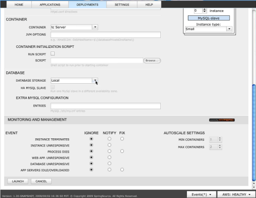 Once the application has been deployed you have a number of options for monitoring and management, including automatic repair of terminated or unresponsive instances, automatic scaling (with configurable limits), and more.