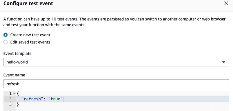 Open the Lambda console, select sap-monitor-hana-<SID> and choose Test. In the Configure test event page, choose Create new test event and enter {“refresh”:true}:
