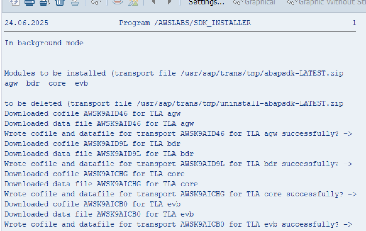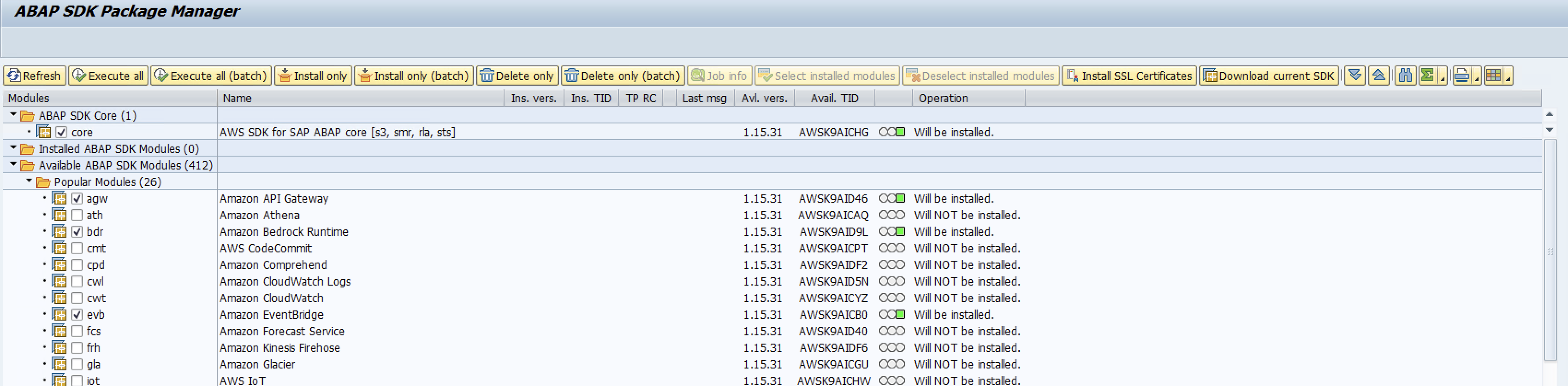 The report currently requires the SAP system it is being run on to have a working Internet connection that allows HTTP(S) and does not offer a true offline experience. The SAP system should be able to establish HTTP and HTTPs connections to the Amazon Trust Services website to download SSL certificates, as well as to the ABAP SDK download page and the ABAP SDK API documentation. There is also currently no option to indicate a path to manually downloaded ABAP SDK .zip files. If customers have demand for that this can get addressed in future revisions of the report. Furthermore, while it is technically feasible to install all modules via the report, e.g., for edge cases like training systems, it can become tedious to click every single checkbox. For this use case, AWS currently offers a command line bash script which helps download and bulk install all available modules. In general, however, it is recommended to only install the modules needed for the specific use case. Alongside this, the ABAP SDK Installer also does not support the AWS SDK for SAP ABAP – BTP edition at this point in time. Lastly, while the report helps starting ABAP SDK installations and/or keeping them up to date, it currently has no means of updating itself, so it is recommended to check the GitHub repo from time to time to get the newest release.