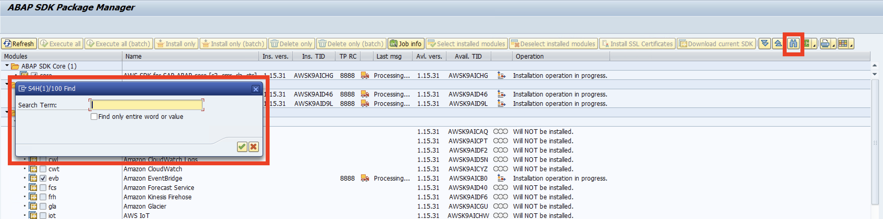 Installing additional modules can be done by selecting their respective checkboxes in the „Available modules” folder. The search function button labeled with the spyglass / magnifying glass icon (depending on the configured SAP GUI (theme) can help if you have trouble finding your desired module in the list. Select the respective checkbox to the left of the module‘s three-letter-acronym (TLA) name. The report offers the option to install & update all modules to latest version of the ABAP SDK (<Execute …> options) or to just install the selected modules without any update (<Install only …> options). In the latter case, the ABAP SDK Installer will download the respective ABAP SDK .zip file version, if not yet present on the system.