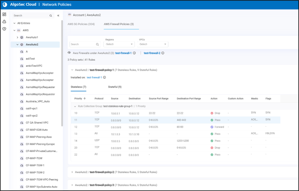 The following screenshot shows the Network Policies page on the AlgoSec Cloud console. The main account page shows the firewalls, the policy sets, and the rules.