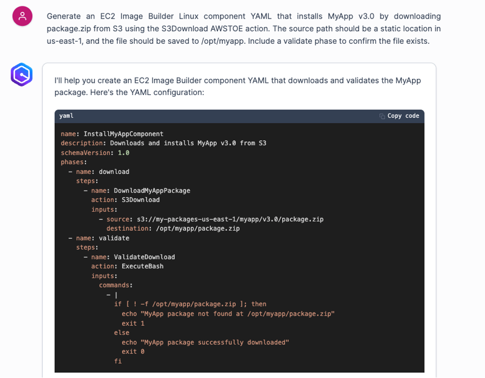 Amazon Q can help accelerate the authoring process but always validate its output against official documentation and through full pipeline testing. By combining automation with rigorous review, you can create Image Builder components that are both efficient to produce and trusted in operation.