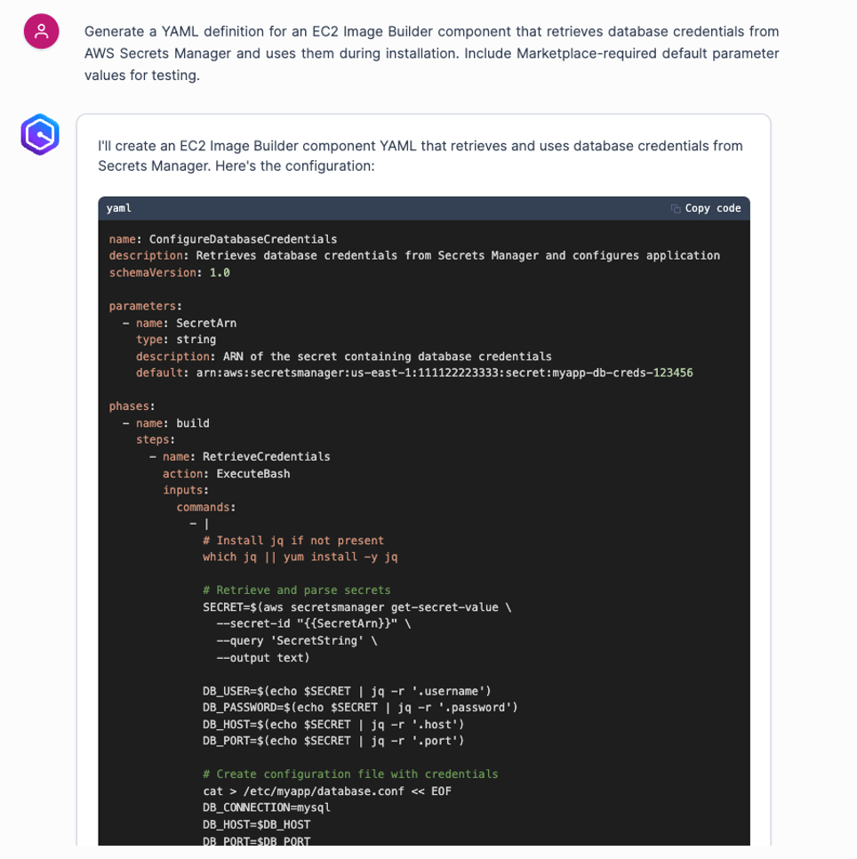 To help you implement these security patterns, you can use Amazon Q. When you prompt Amazon Q to create a component that uses AWS Secrets Manager, it generates YAML that includes secure credential retrieval, proper error handling, and the required parameter schemas for AWS Marketplace validation. The generated code demonstrates how to safely retrieve and use credentials during installation while maintaining the security standards required for AWS Marketplace components.