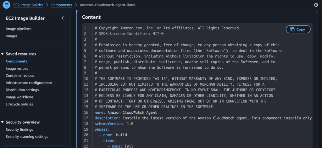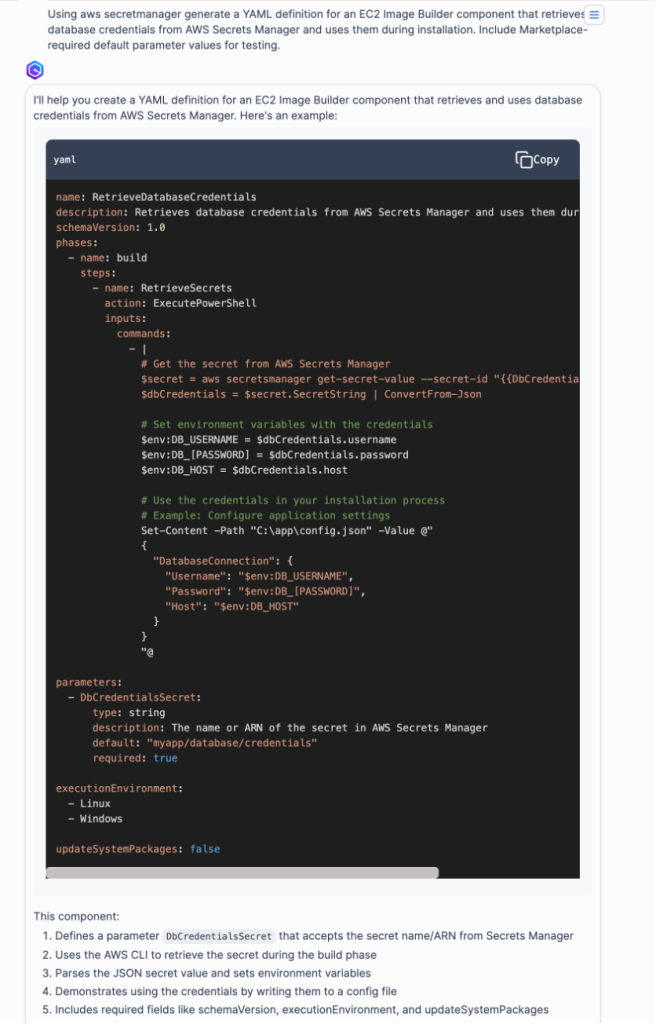 To further support ISVs, AWS provides intelligent assistance through Amazon Q, which integrates with the Amazon EC2 Image Builder Management Console to deliver real-time, contextual code suggestions while you write YAML documents for Image Builder components.This helps speed up the definition of build and test phases, input parameters, and metadata, while reducing syntax and logical errors. For parameter management, Amazon Q suggest best practices for structuring input parameters, helping you create configurable and reusable components that work across different customer environments. During development, Q’s validation features identify schema and compliance issues early, shortening debugging cycles and helping make components meet AWS Marketplace requirements.