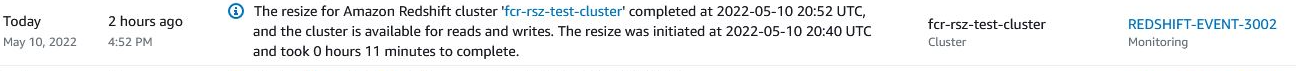 You can monitor the progress through the cluster management console. You can also check the events generated by the resize process. The resize completion status is logged in events along with the duration it took for the resize. The following screenshot shows an example.