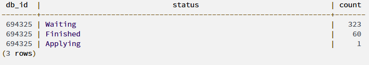 The following table shows that for 60 tables data redistribution is finished, for 323 tables data redistribution is pending, and for 1 table data redistribution is in progress.