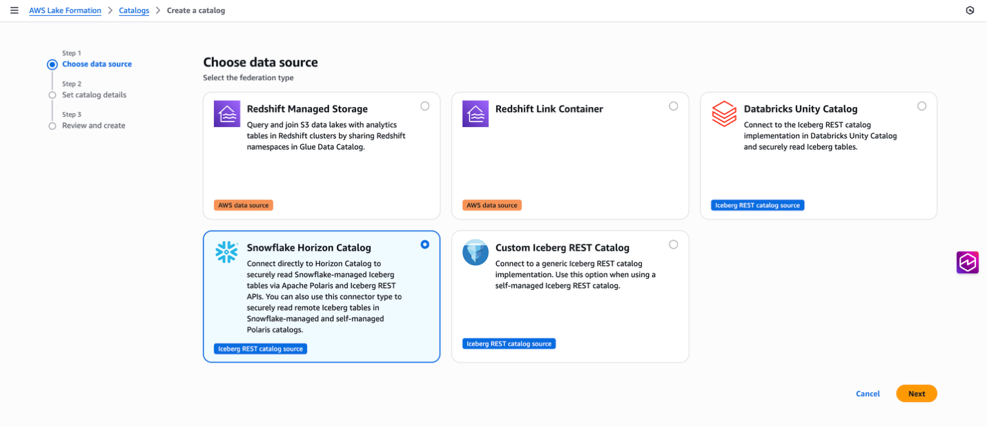 - Choose the data source as Snowflake Horizon Catalog.