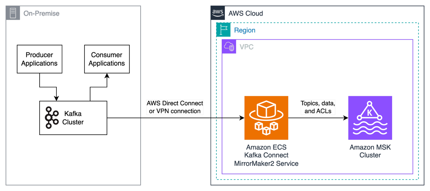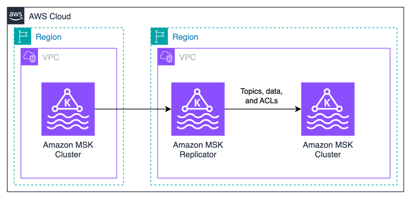 - Cross-cloud or hybrid cloud scenarios – Replicating between Kafka running on-premises or on different cloud providers and Amazon MSK for disaster recovery or data analytics use cases