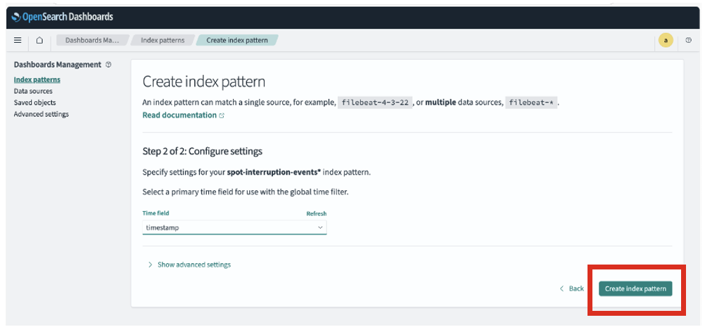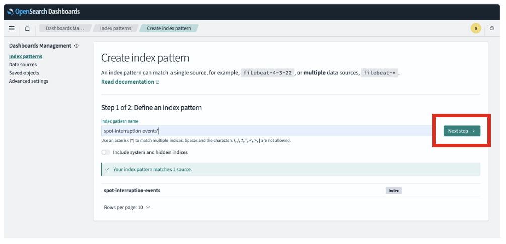 The index pattern name should be the index name you entered during the deployment followed by an asterisk. See the following screenshot for reference.
