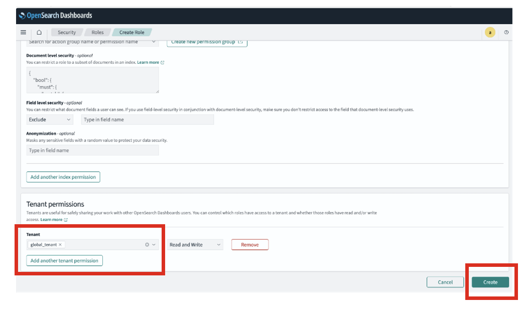 - Set the Tenant Permissions to “global_tenant” as seen in the image and Choose “Create”.