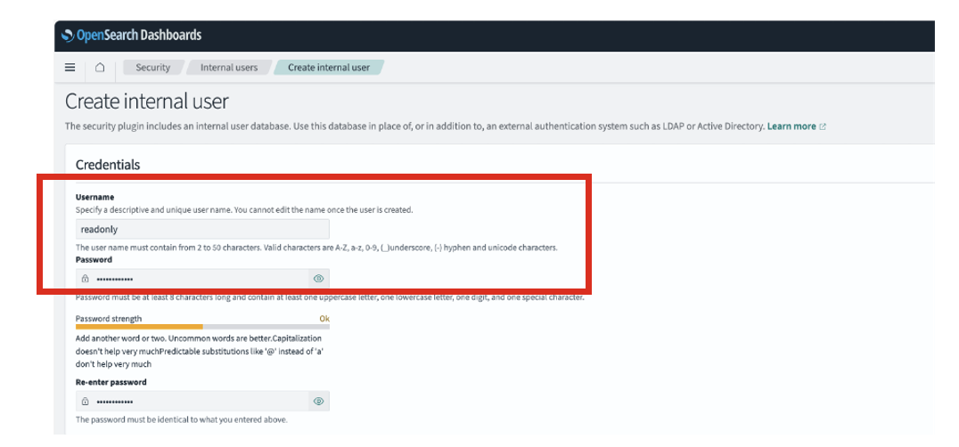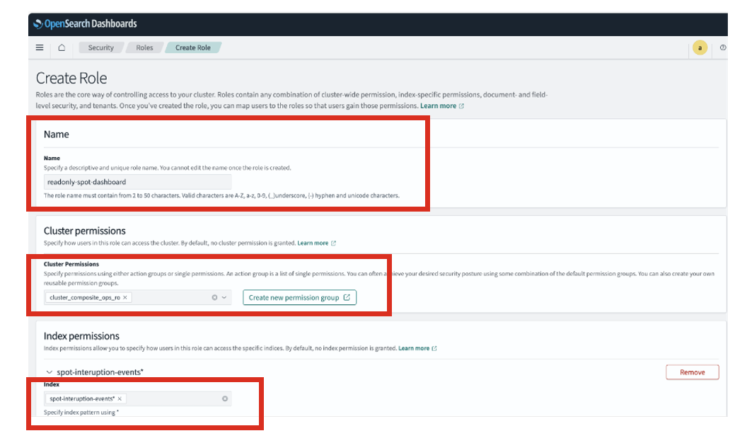In this section you will create a new user and a role with read-only access, then assign the role to the user to grant them read-only access to the Spot Interruption dashboard and visualizations.