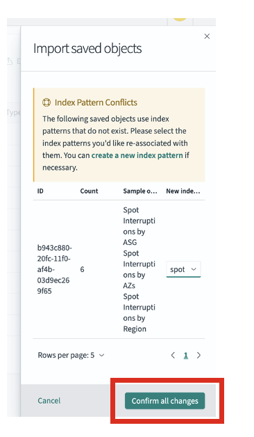 spot-interruption-dashboard-visualisations.ndjsonfile. - During the import, you may encounter index pattern conflicts. Select the index pattern you created from the dropdown and choose “Confirm all changes”.
