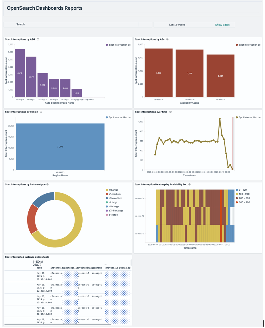 OpenSearch Dashboards visualize interruption metrics, delivering actionable insights to support effective capacity planning and workload placement.