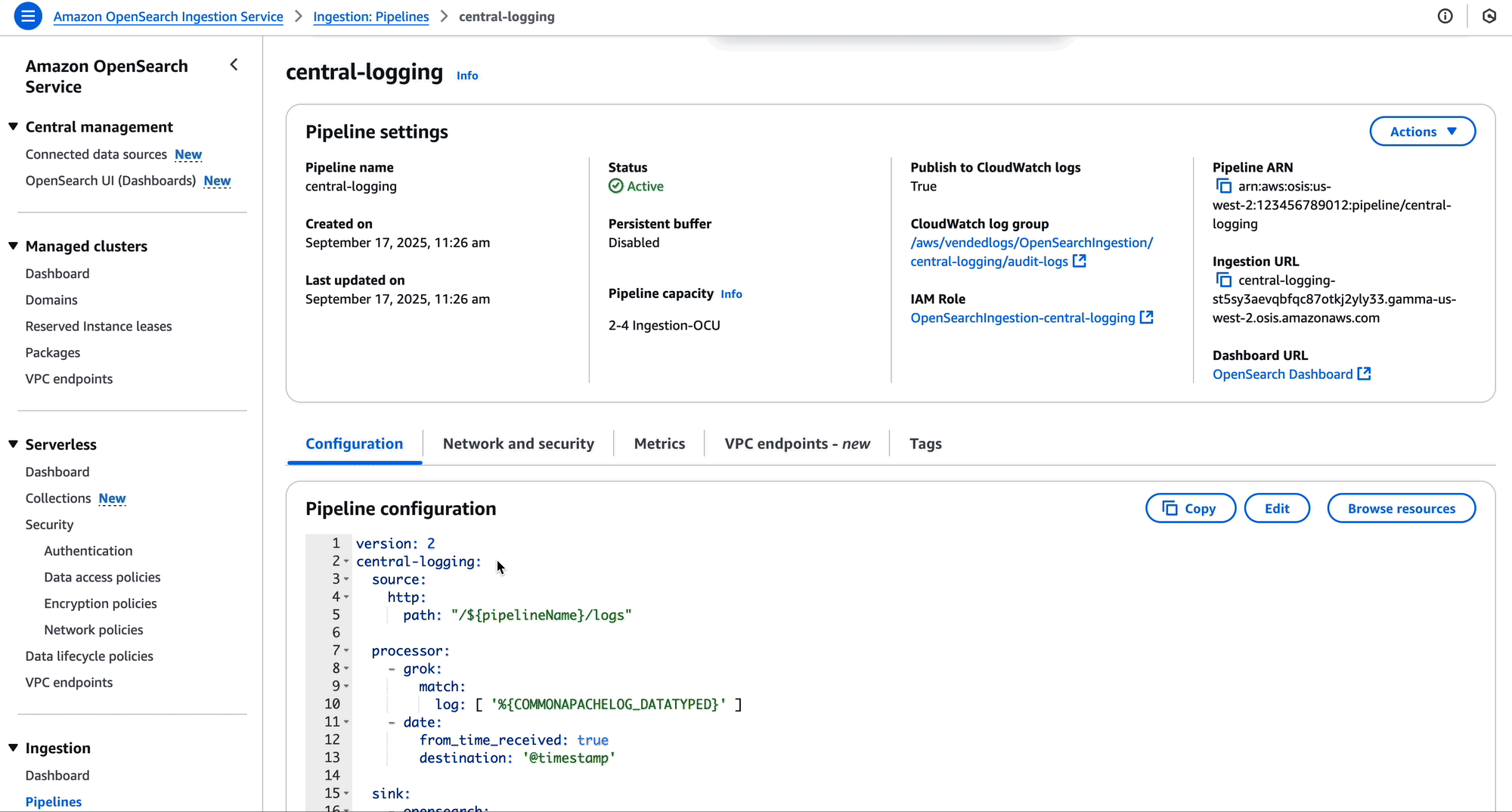 The central logging account must also create a push-based OpenSearch Ingestion pipeline in the VPC. This can be a pipeline receiving logs from FluentBit or OpenTelemetry telemetry.