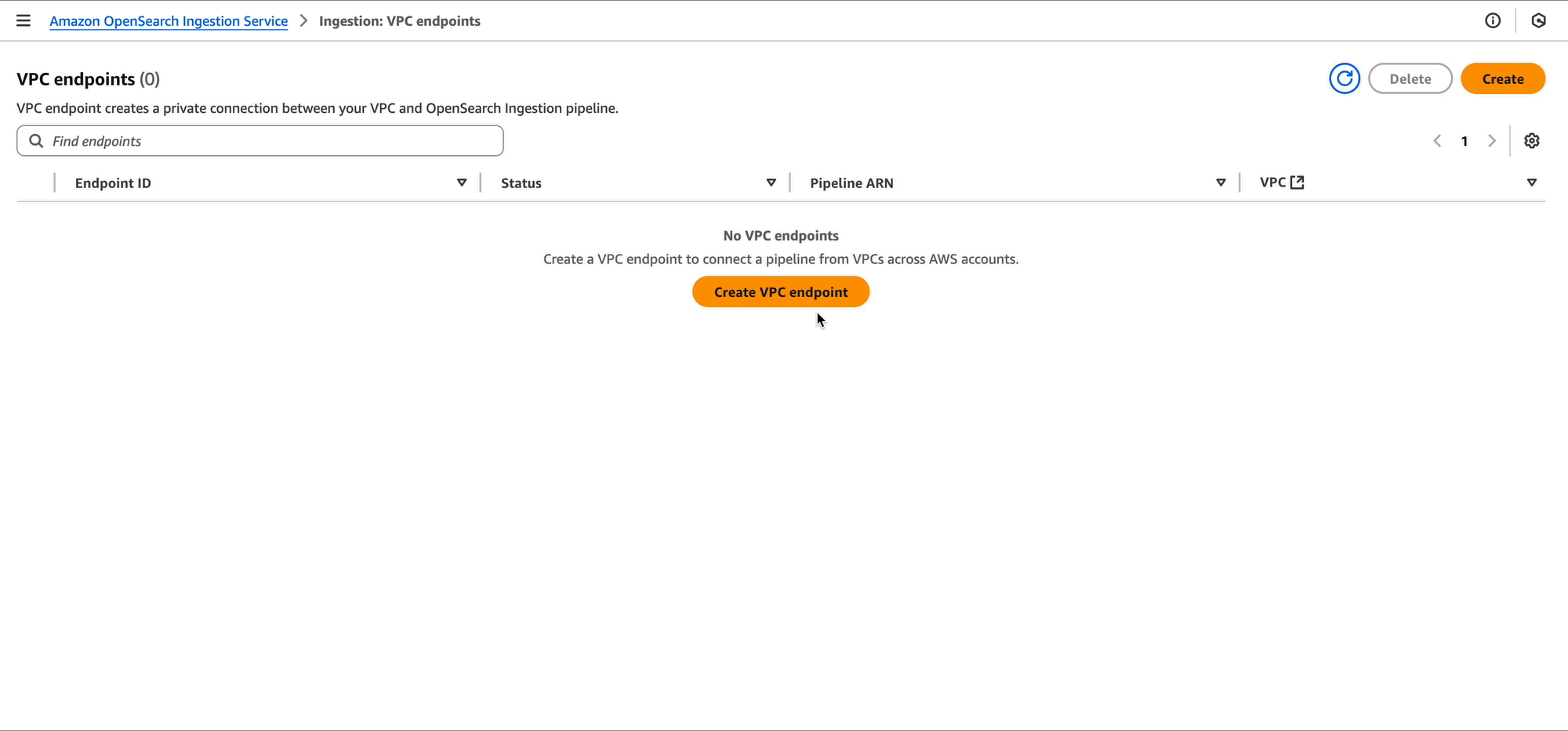 Now that the central logging account has shared permissions on their pipeline, the development accounts can create pipeline endpoints. A pipeline endpoint is a connection from one VPC to an OpenSearch Ingestion pipeline.