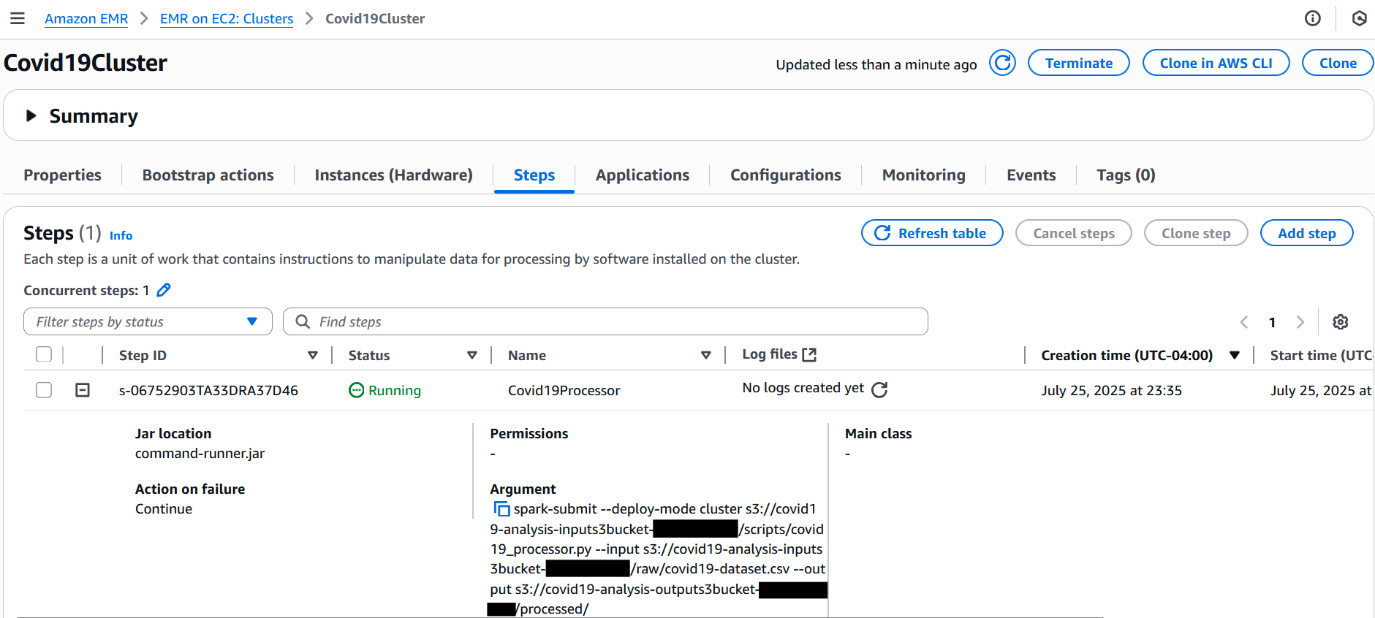 Initially, it will be in Starting status.On the Steps tab, you can see your Spark submit step listed. As the job progresses, the step status changes from Pending to Running to finally Completed or Failed.