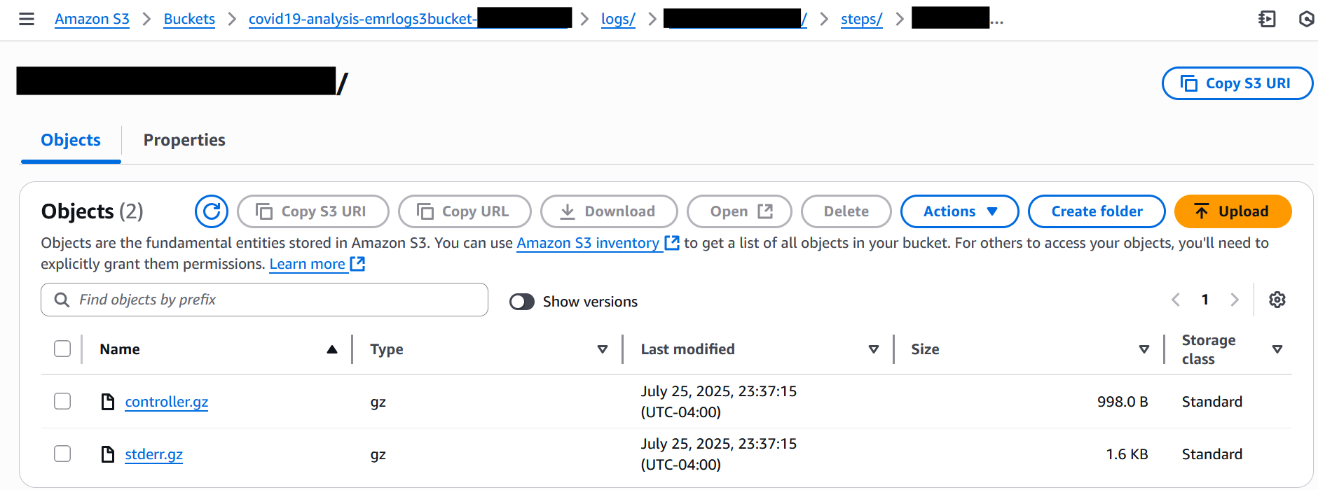 After the workflow is complete, regardless of whether it succeeds or fails, you can perform a detailed post-execution analysis by reviewing the logs stored in the S3 bucket specified in the LogUri parameter. This log directory includes standard output and error logs, along with Spark history files, offering insights into execution behavior and performance metrics.