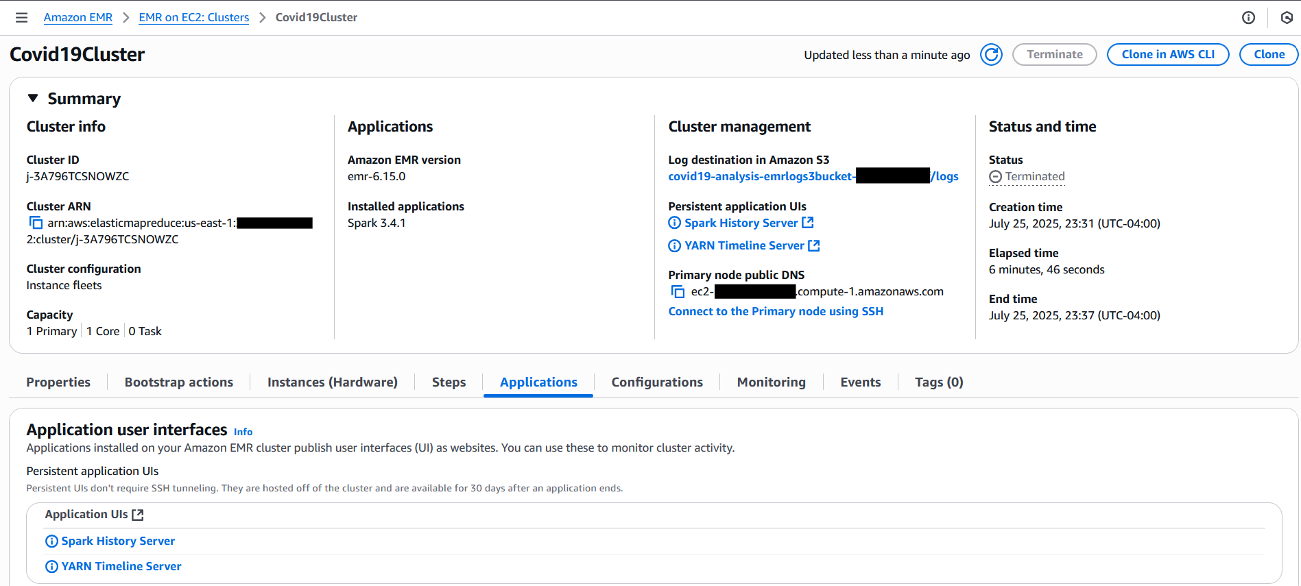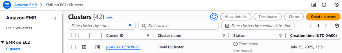 When the Spark step is complete, Step Functions will automatically delete the Amazon EMR cluster. Refresh the Clusters page on the Amazon EMR console. You should see your cluster status change from Terminating to Terminated within a minute.