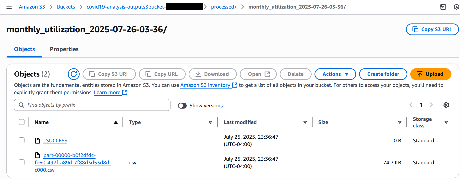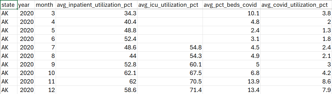 The script reads the raw dataset, standardizes various date formats, and filters out records with invalid or missing dates. It then extracts key utilization metrics such as inpatient bed usage, ICU bed usage, and the percentage of beds occupied by COVID-19 patients and calculates monthly averages grouped by state. The aggregated output is saved as timestamped CSV files in the specified S3 location.