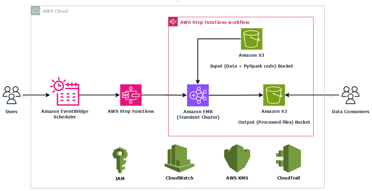 The infrastructure is deployed using AWS CloudFormation to provide consistency and repeatability. AWS Identity and Access Management (IAM) roles grant least‑privilege access to Step Functions, Amazon EMR, EC2 instances, and S3 buckets, and optional AWS Key Management Service (AWS KMS) encryption can secure data at rest in Amazon S3 and Amazon CloudWatch Logs. By combining a scheduled trigger, stateful orchestration, and centralized logging, this solution delivers a fully automated, cost‑optimized, and secure way to run transient Spark workloads in production.