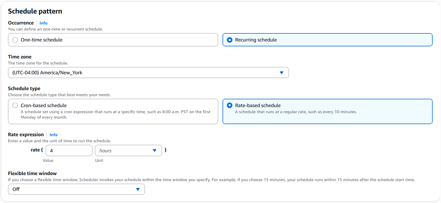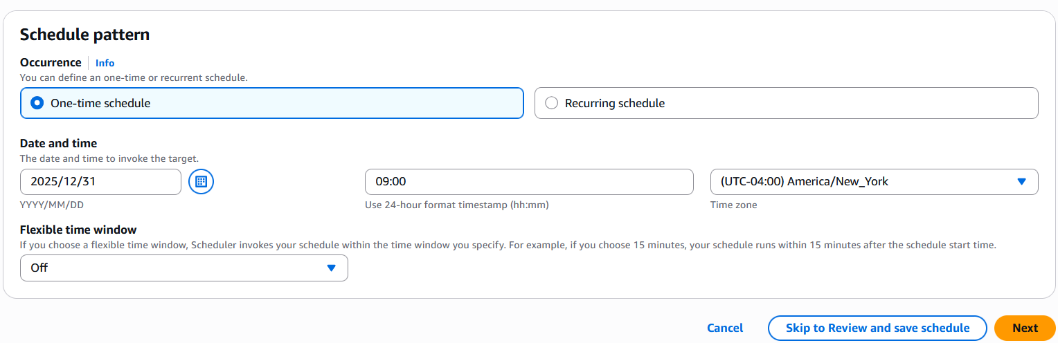 - If you want to run this on a recurring basis, select Recurring schedule. Specify the schedule type as either Cron-based schedule or Rate-based schedule as needed.