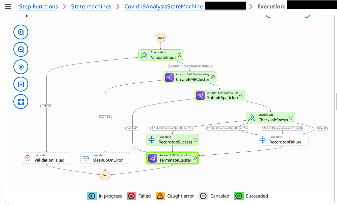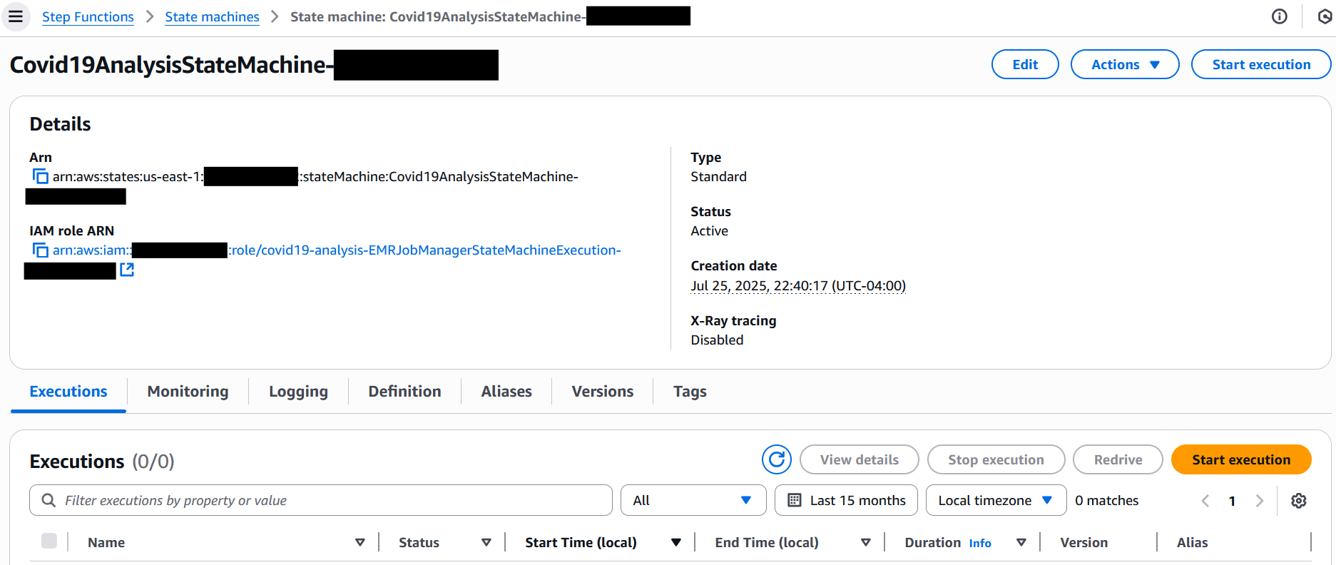 - Choose the state machine that begins with Covid19AnalysisStateMachine-*.