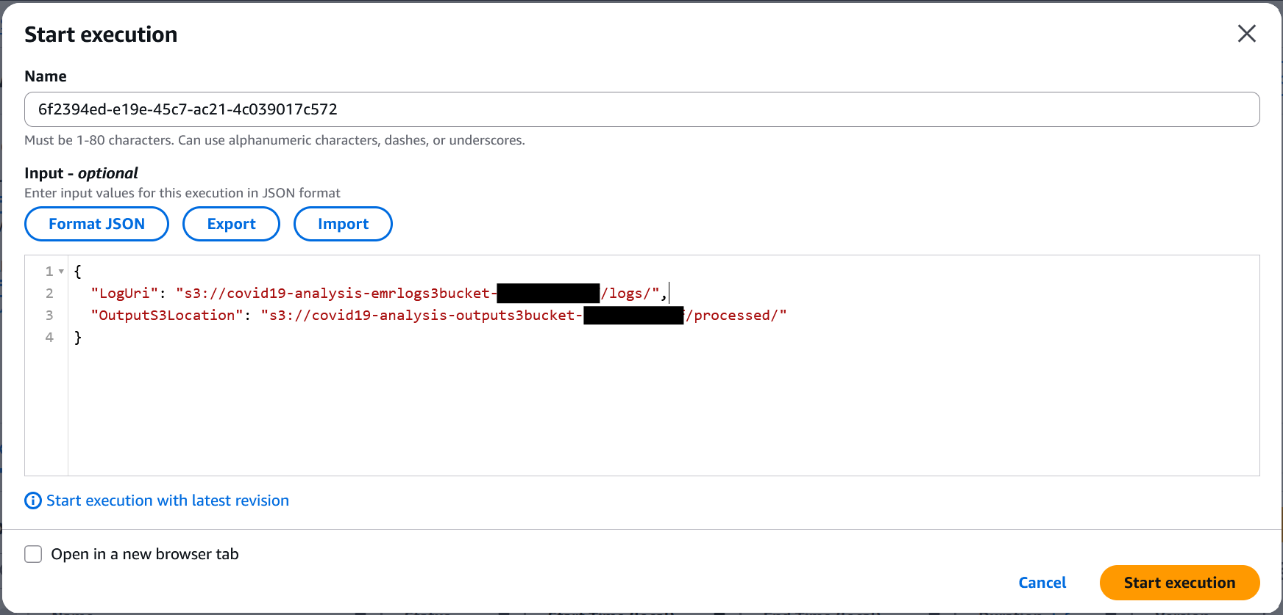 - In the Input section, provide the following JSON (provide the log bucket and output bucket names with the appropriate values captured earlier):