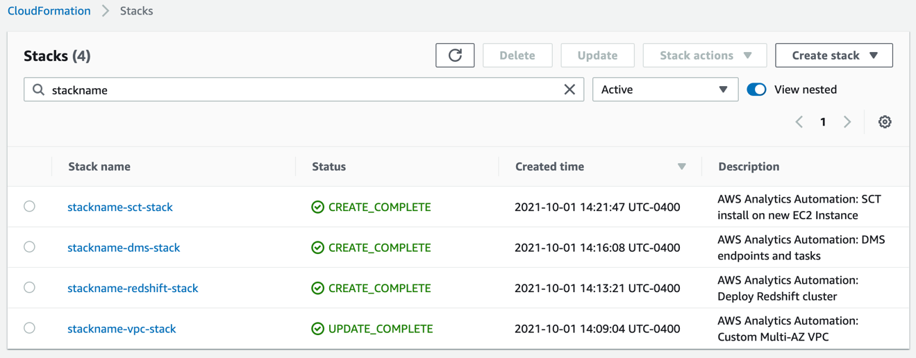 Each stack corresponds to the creation of a resource from the config file. You can see the newly created VPC, Amazon Redshift cluster, EC2 instance running AWS SCT, and AWS DMS instance.