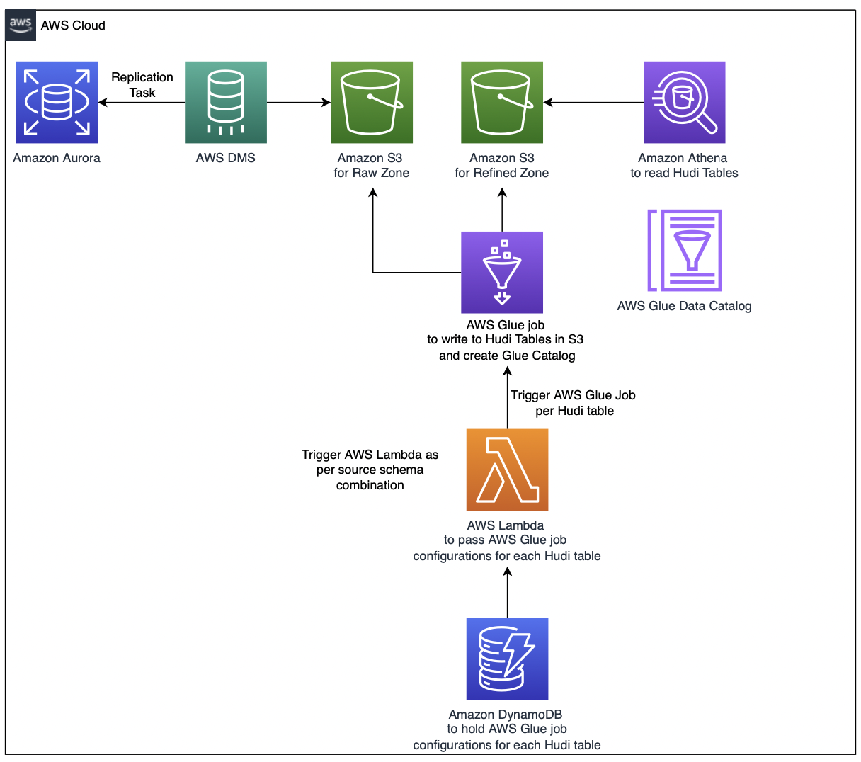 In this post, the schema evolution of source tables in the Aurora database is captured via the AWS DMS incremental load or change data capture (CDC) mechanism, and the same schema evolution is replicated in Apache Hudi tables stored in Amazon S3. Apache Hudi tables are discovered by the AWS Glue Data Catalog and queried by Athena. An AWS Glue job, supported by an orchestration pipeline using Lambda and a DynamoDB table, takes care of the automated replication of schema evolution in the Apache Hudi tables.