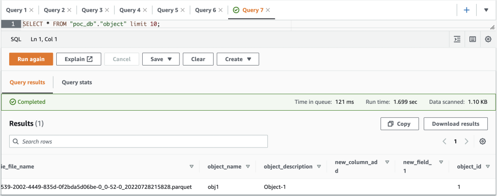 After you add the column test_column and insert a value in the test_column field in the object table in the Aurora database, the new column (test_column) is reflected in its corresponding Apache Hudi table in the data lake.