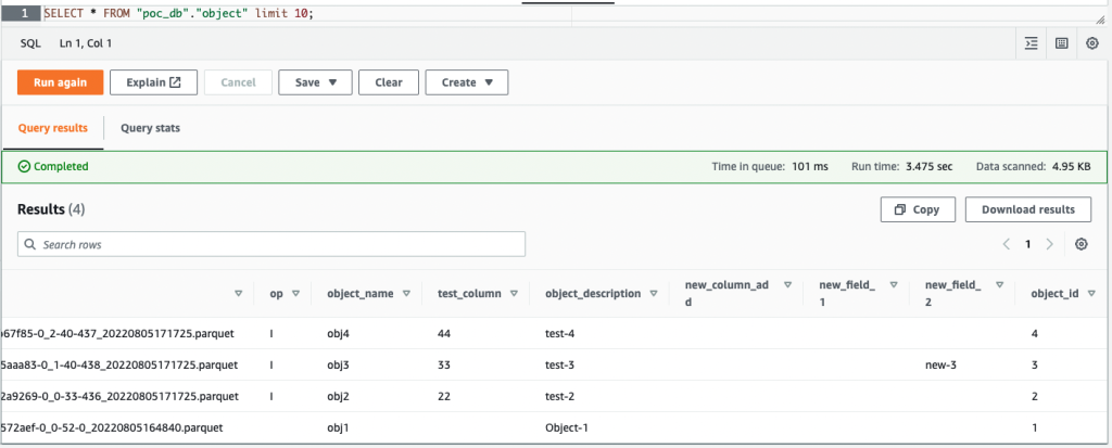 Now we complete the following steps to change the schema at the source. Trigger the Lambda function after each step to generate a file in the POC/db/object folder within the raw bucket. AWS DMS almost instantly picks up the schema changes and reports to the raw bucket.