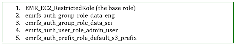 First, the admin user admin1 tries to log in and run a command to access Amazon S3 data through EMRFS. The first role emrfs_auth_user_role_admin_user on the mapping list, which is a user role, is mapped and picked up. Then admin1 has access to the Amazon S3 locations that are defined in this role.