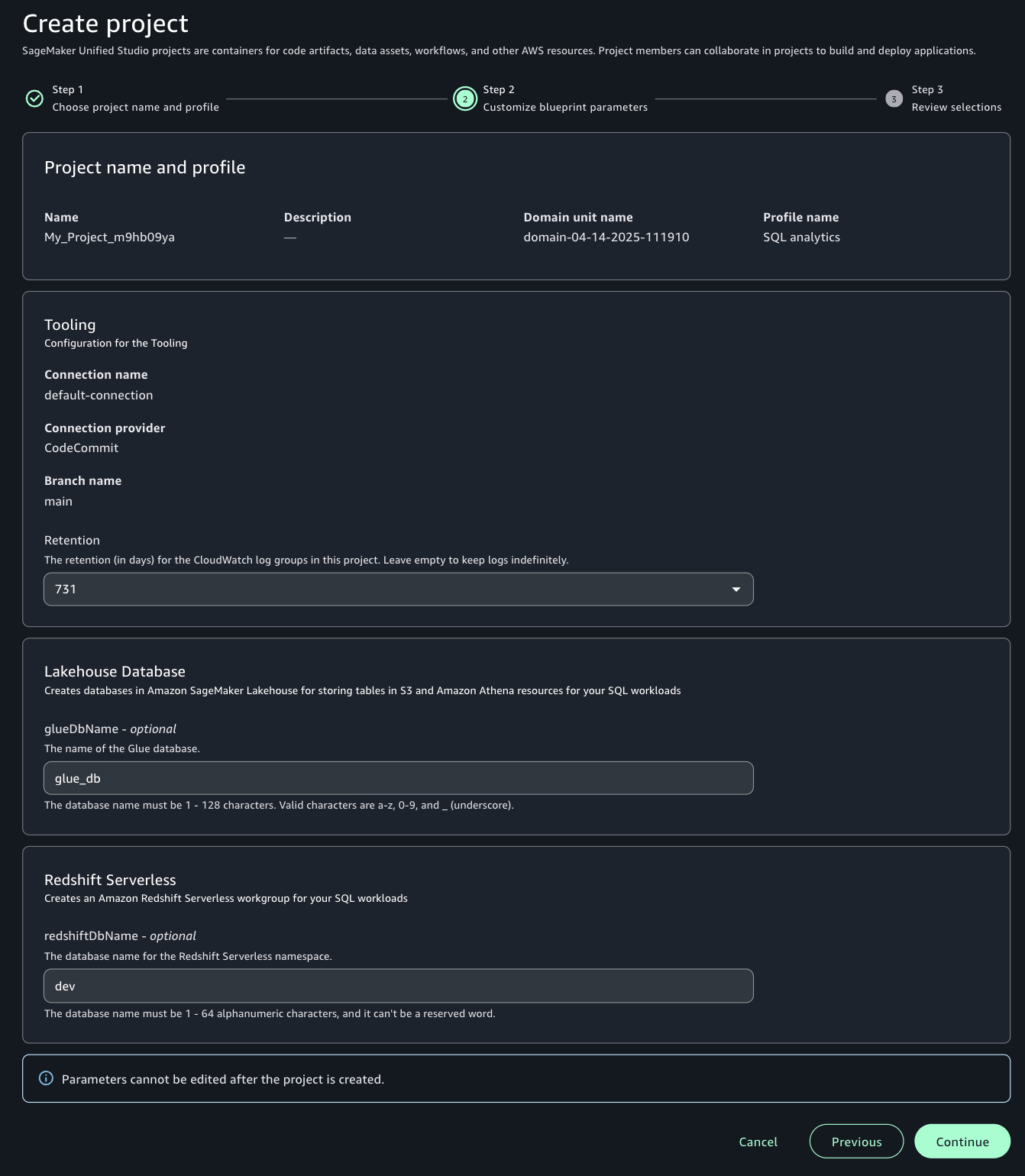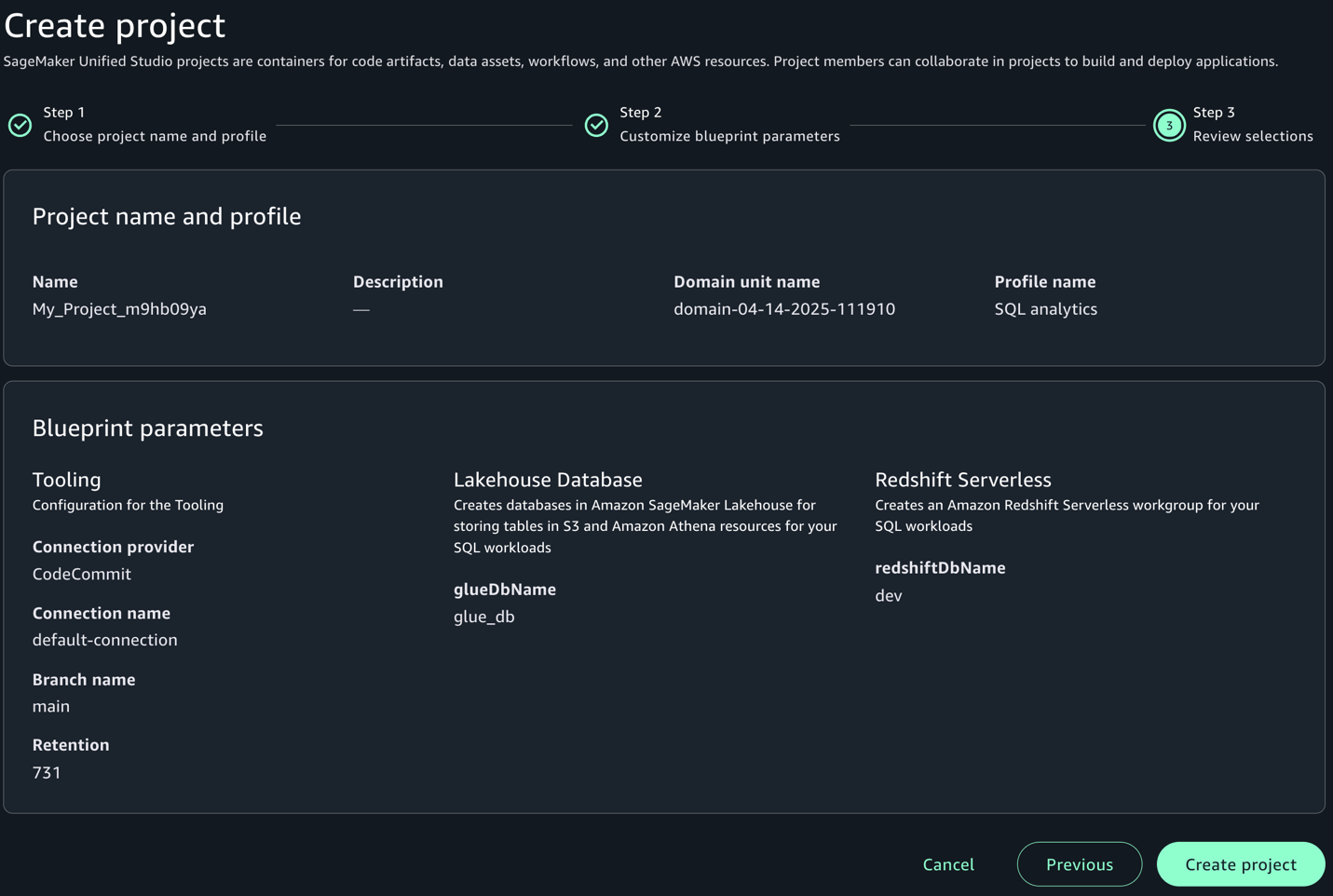 In this step, we federate into SageMaker Unified Studio and create a project using SQL analytics. Complete the following steps:
